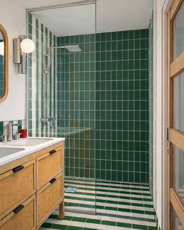 La salle d’eau et les toilettes offrent une expression plus affirmée du style Arts & Crafts souhaité par le client. Ces espaces deviennent des parenthèses décoratives, où motifs, textures et couleurs s’expriment avec subtilité, sans altérer la sérénité des pièces principales.